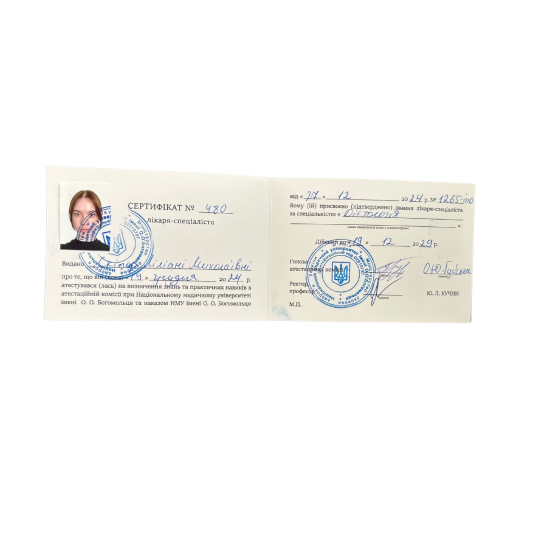 Я - лікар-дієтолог з повною медичною освітою: закінчила Буковинський державний медичний університет і спеціалізацію з дієтології в Київському медичному університеті. Працюю та супроводжую пацієнтів онлайн. Моя мета - допомагати людям покращувати здоров’я через прості, доказові та реалістичні кроки , які легко втілювати в життя.