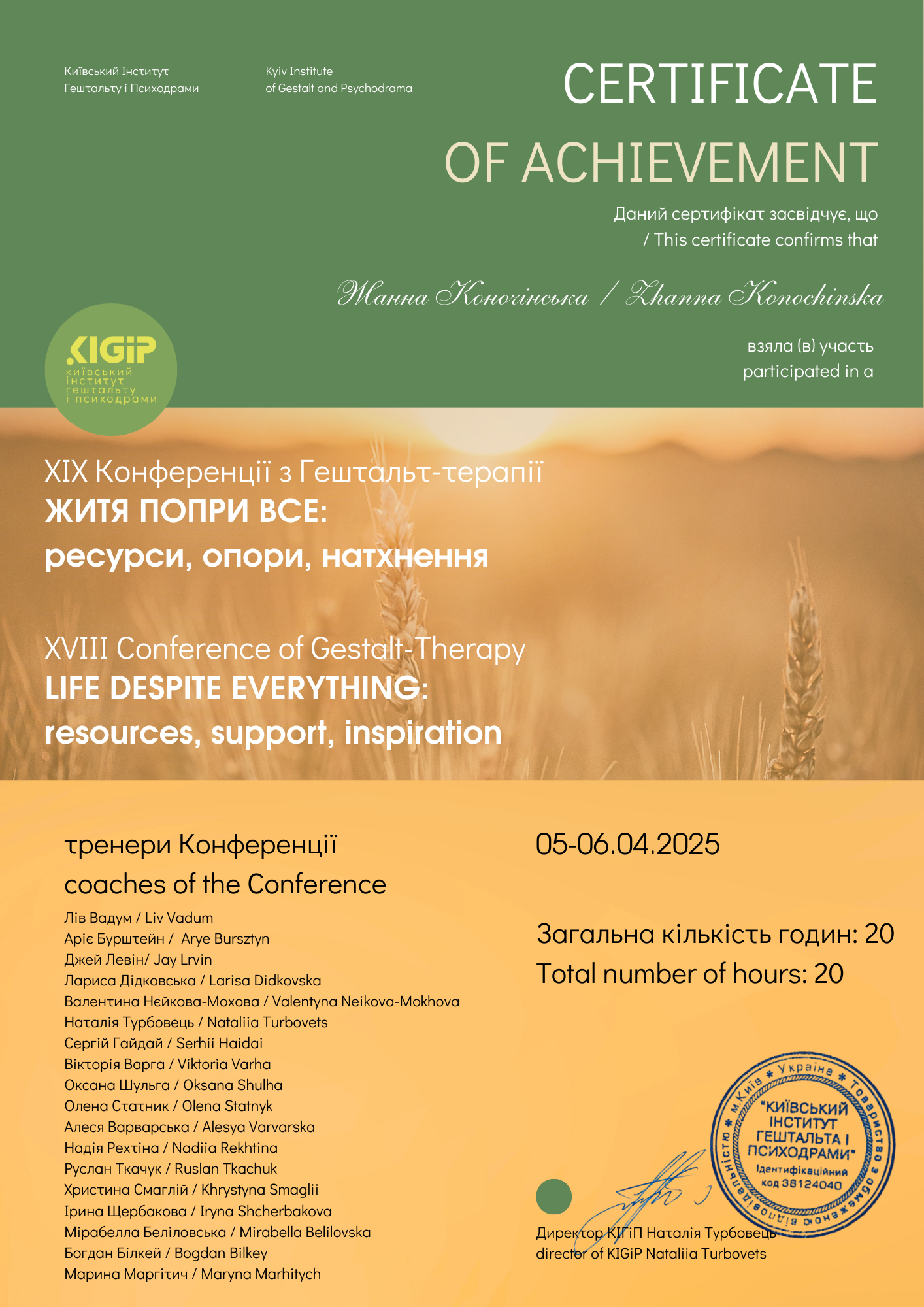 Гештальт-терапія — це мій усвідомлений вибір та покликання, це мій основний метод, у якому я працюю, розвиваюсь та отримую супервізії. Гештальт-терапія допомагає усвідомити глибокі внутрішні конфлікти та установки, побачити, як саме вони проявляються в житті та заважають отримувати від неї щиру радість, задоволення та бути по-справжньому щасливим. Усвідомленість дає вибір, а все, що не усвідомлюється, швидше керує нами і здається нам долею.