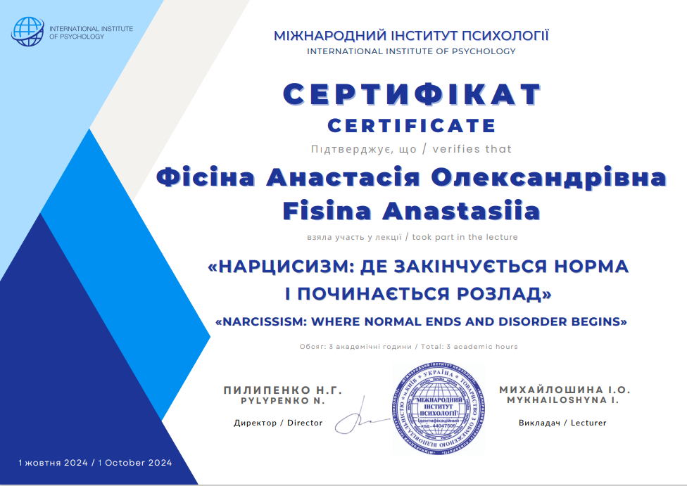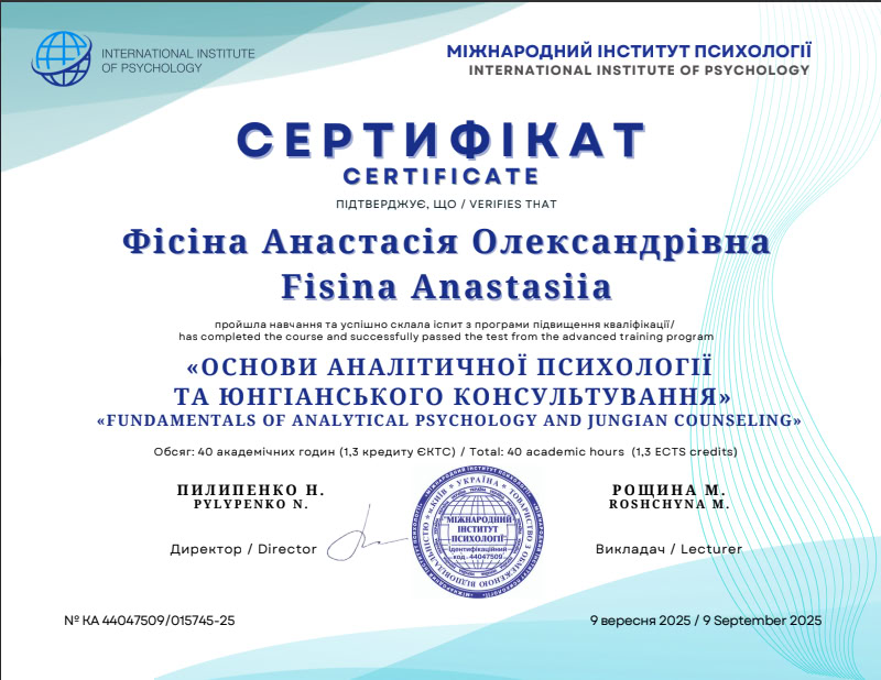 Мене звати Анастасія, я дипломований психолог, психоаналітик та арттерапевт. Основна направленість в роботі - допомога особам, які постраждали від домашнього та/або гендерно зумовленого насильства. Моя місія – допомагати людям краще розуміти себе, знаходити вихід із складних ситуацій та будувати гармонійне життя. Мої клієнти – це люди, які шукають підтримку, розуміння та ефективні рішення для своїх викликів. Я створюю безпечний і довірчий простір, де кожен може бути собою, відкрито говорити про свої переживання і працювати над особистими змінами. Я вірю, що кожна людина має внутрішній ресурс для змін, і моя мета – допомогти вам його знайти через методи арттерапії. Запрошую на консультацію!