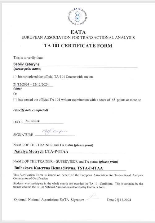 У своїй роботі завжди зосереджена на запиті клієнта, створюючи при цьому атмосферу безпеки та довіри, завдяки цезоціночному прийнятті та емпатії до унікального внутрішнього світу клієнта, його Думок, емоцій, досвіду, історії. Тож буду рада співпраці!