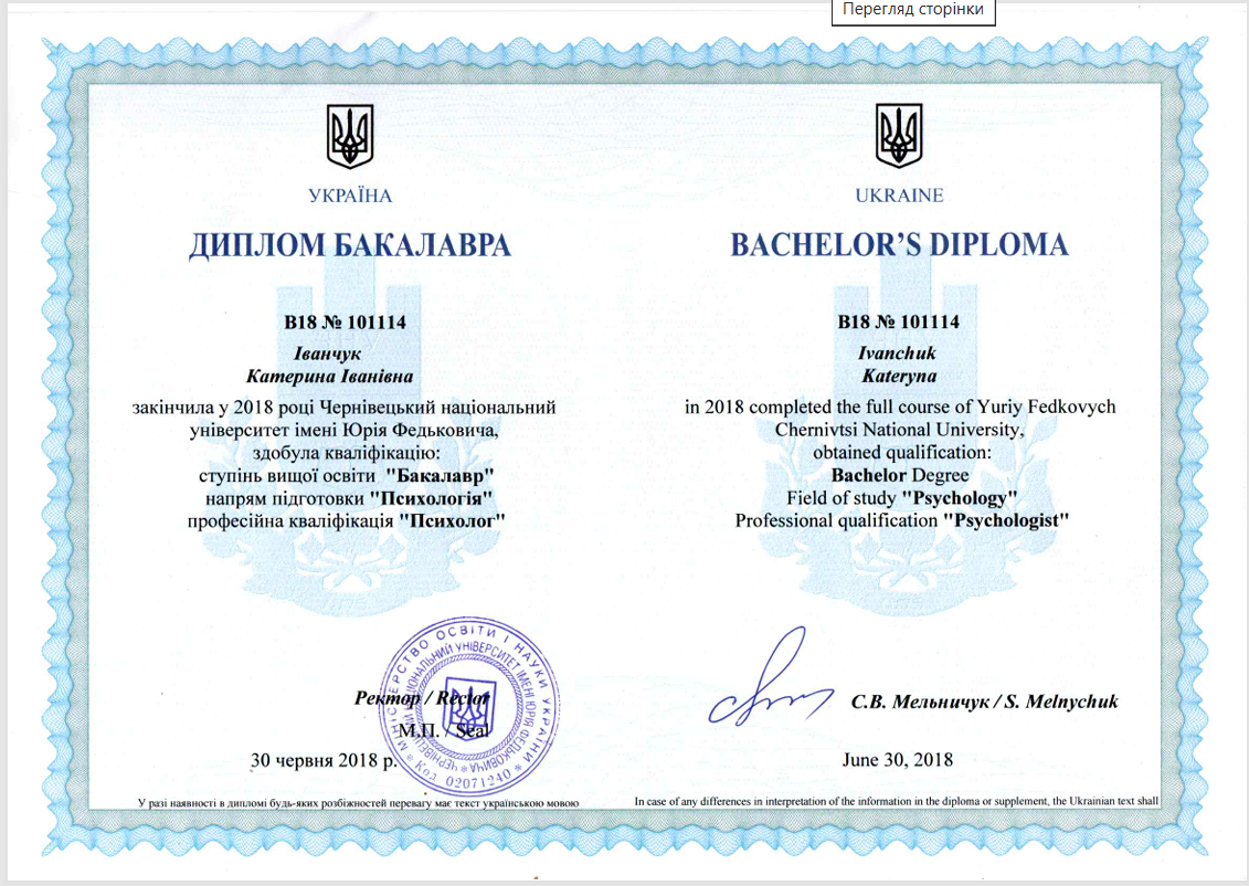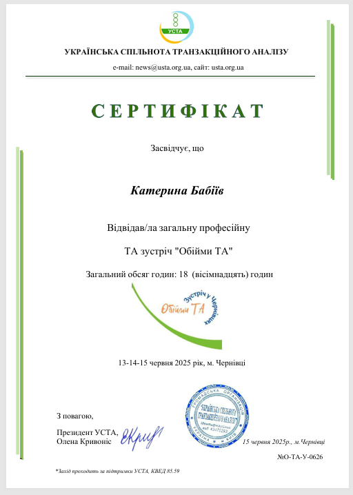 Привіт! Мене звати Катерина, я дипломований психолог. Прийшла в цю професію через власну історію та на своєму досвіді відчула, як це змінює якість життя на краще. Мені завжди було цікаво чому люди поводяться тим чи іншим чином. Досліджувати що спонукає та надихає мене робити ті чи інші речі. Власний досвід та професійна цікавість доповнюють одне одного та надихають, а це в свою чергу дає можливіть якісно працювати.
