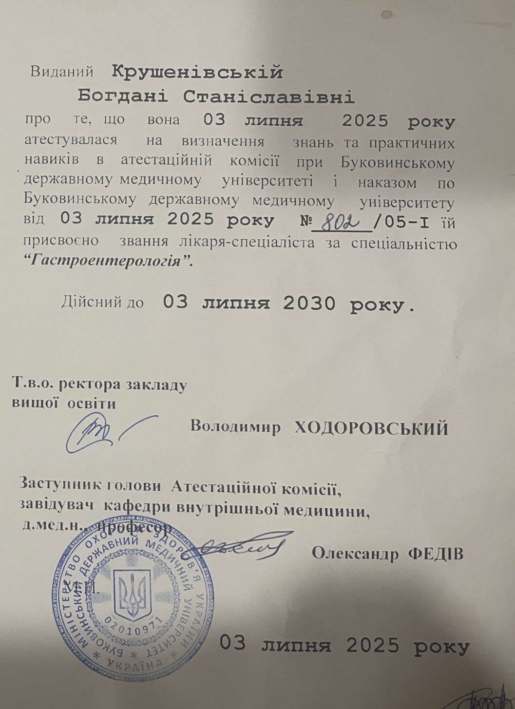 Вітаю, мене звуть Богдана Станіславівна.  Я працюю в галузі медицини вже 5 років і захоплююся своєю професією, оскільки вона дозволяє допомагати людям зберігати та покращувати здоров'я.За роки практики я здобула досвід у сфері дерматології, гастроентерології та терапії. Моя мета – завжди надавати пацієнтам найвищу якість допомоги, спираючись на свої знання та досвід.