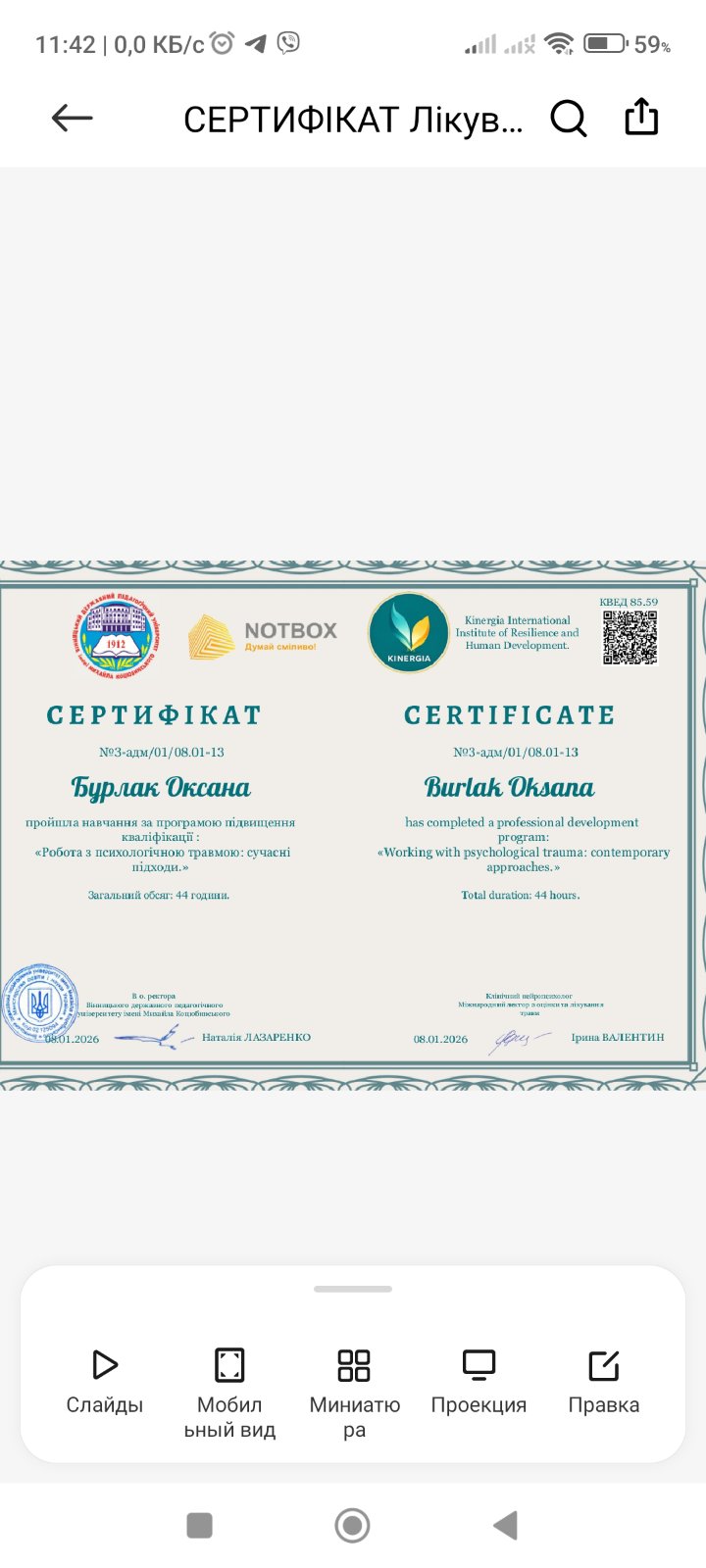 Про психологію мріяла ще тоді, коли навчалась в школі. Мій Фрейд (книга) мене чекав. Моє професійне життя дає мені можливість багато комунікувати з дітьми і підлітками та їх батьками, з педагогічною спільнотою. Тут я навчилась не тільки слухати, а й чути,не лише дивитися, а й відчувати серцем біль і тривогу. Я зрозуміла, скільки людей потребують допомоги,тепла та підтримки. Отримала другу вищу освіту за спеціальністю "психологія" (УДУ імені М.Драгоманова), пройшла навчання і сертифікацію в напрямку позитивна психотерапія (Пезешкіан) World Association for Positive and Transcultural Psychotherapy (WAPP) Center for Positive Psychotherapy "Positum Phenomenon", Kyiv, Ukraine. Позитивна психотерапія фокусується на ваших ресурсах, а не на ваших недоліках. Ми не просто шукаємо проблему, а будуємо нову, гармонійну реальність, використовуючи ваші сильні сторони. Цей напрямок розглядає особистість за моделлю балансу та опирається на актуальні здібності. Я допомогаю клієнтам нормалізувати самооцінку,приборкати тривогу та страхи, звільнитися від образи та провини, знайти свою внутрішню опору та довіру до себе, відновити сили після вигорання та знайти свій шлях у житті.