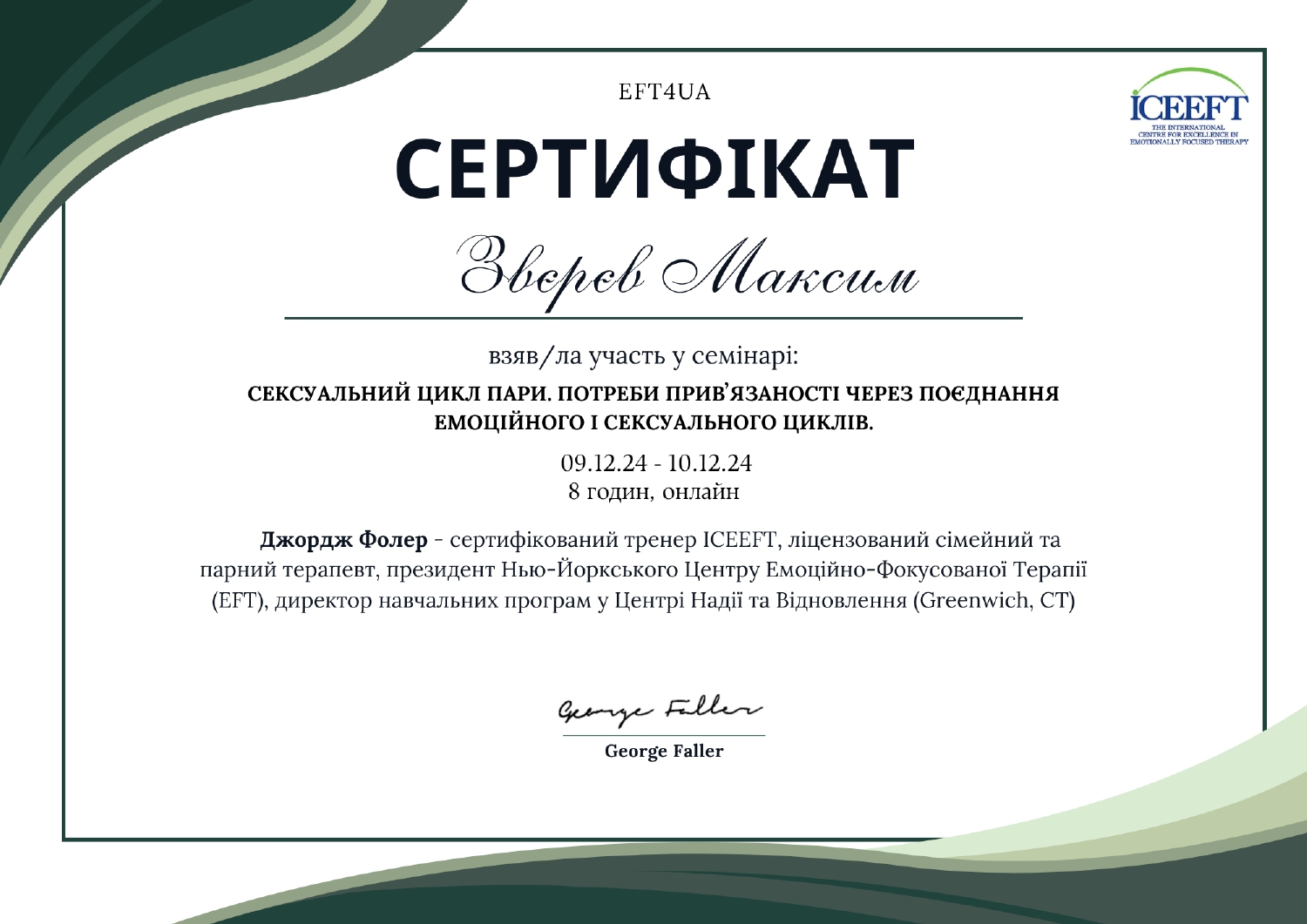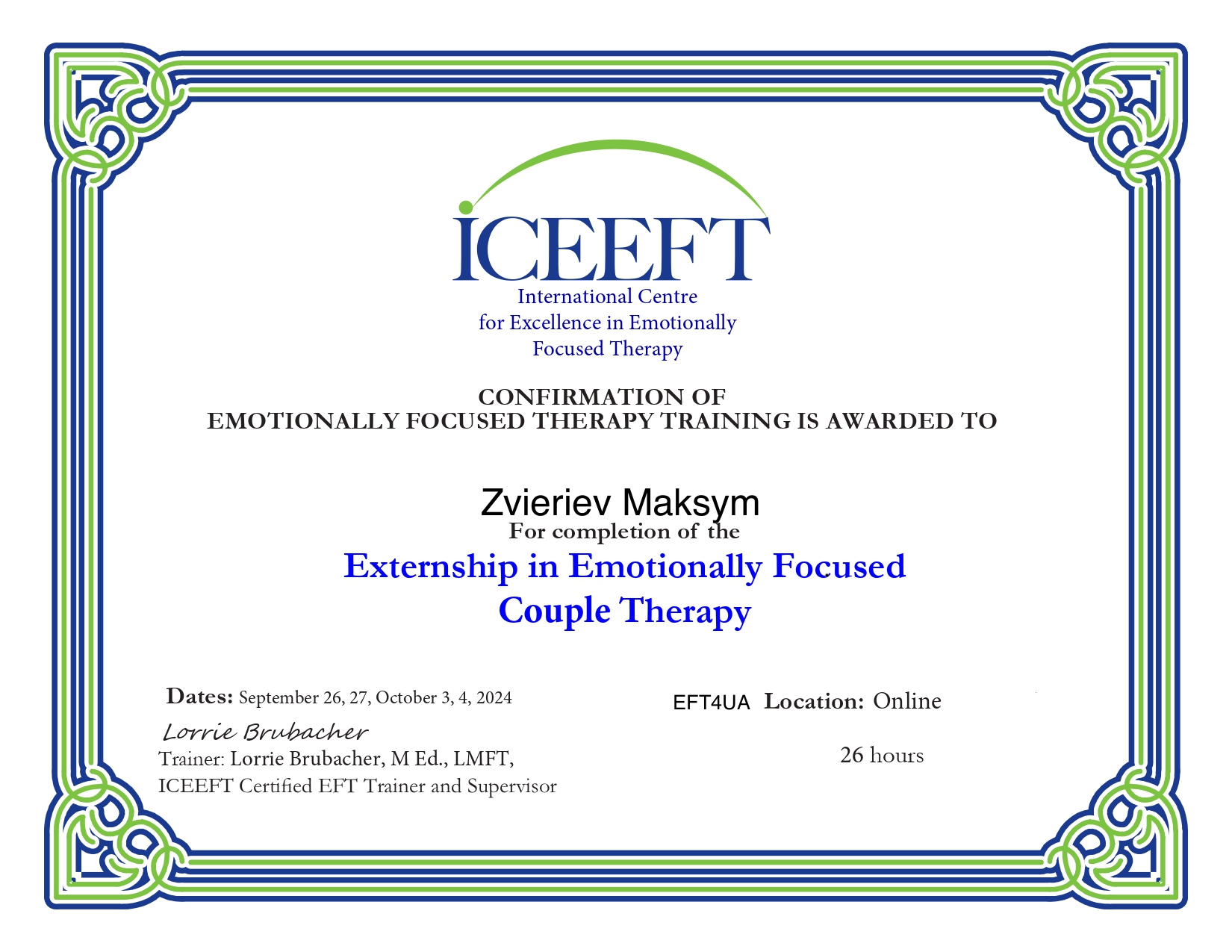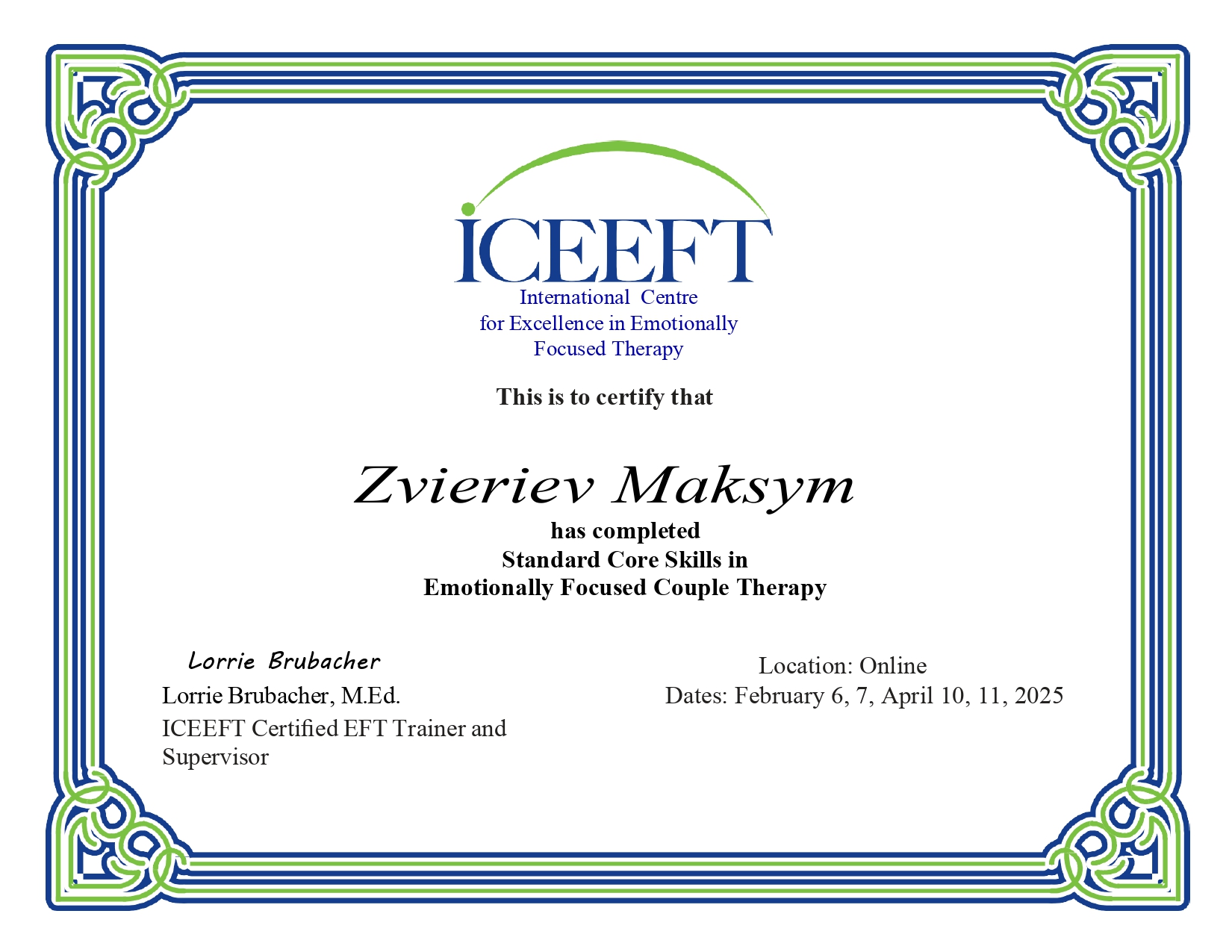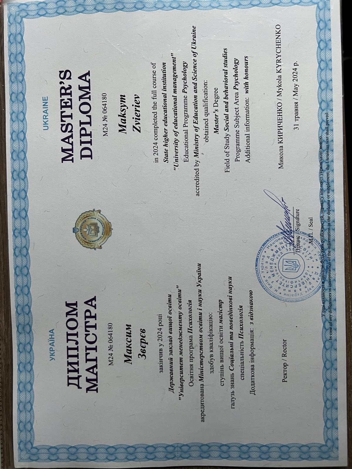 Отримав диплом магістра з психології (також маю економічну та теологічну освіту), пройшов (і проходжу) безліч навчань, отримав сертифікат в доказовому методі ЕFT (емоційно-фокусована терапія для пар).