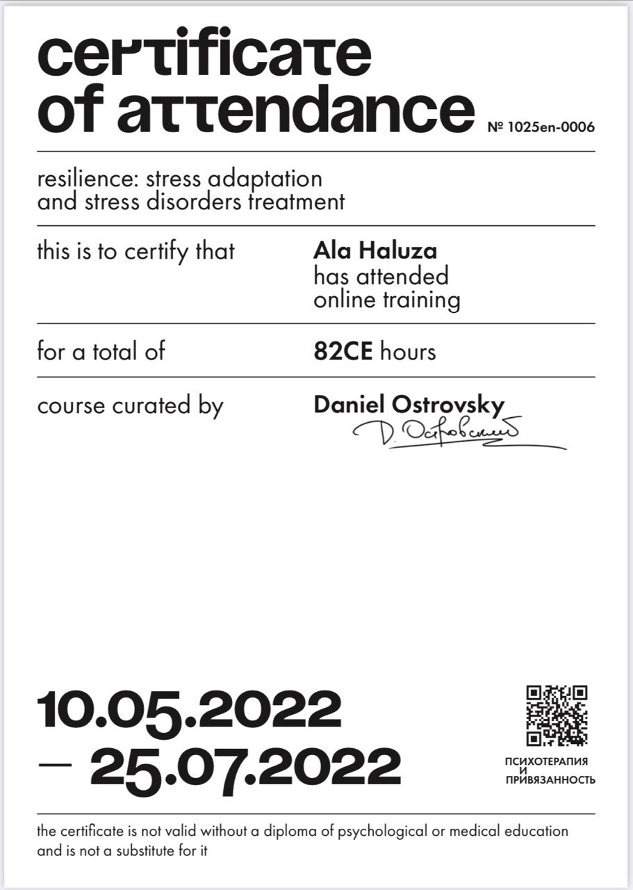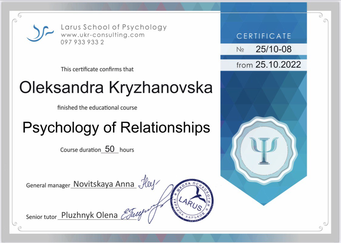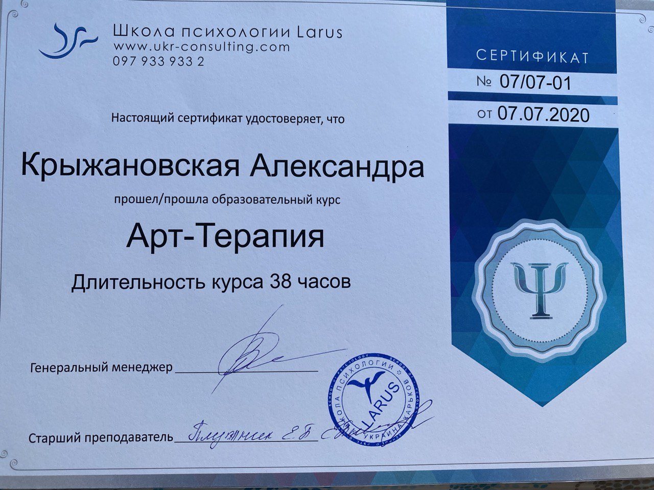 • Працюю з підлітками та дорослими, використовуючи інструменти психосоматики, символдрами та арт-терапії. Допомагаю у роботі зі страхами, емоціями, самооцінкою та стосунками.
