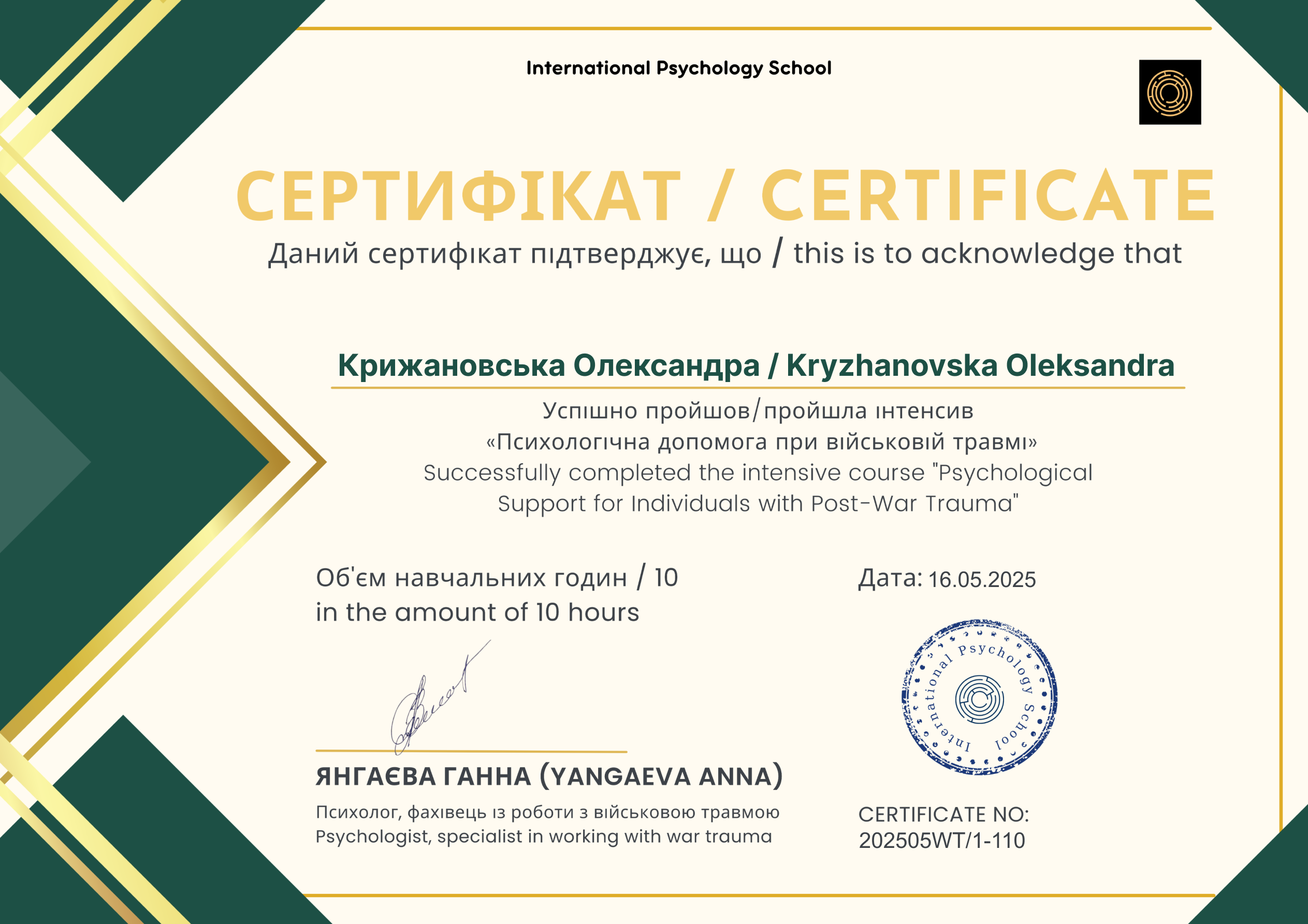 Я практикуючий психолог із понад 5-річним досвідом. Працюю з підлітками та їхніми батьками, маю досвід організації та ведення великих підліткових проєктів. Веду приватну практику — індивідуальну та групову. Працюю з дорослими та підлітками. Постійно вдосконалюю свої знання: перебуваю в супервізії та власній терапії, нині навчаюся на магістратурі клінічного психолога. Психологія для мене — це не просто професія, а справжнє покликання.