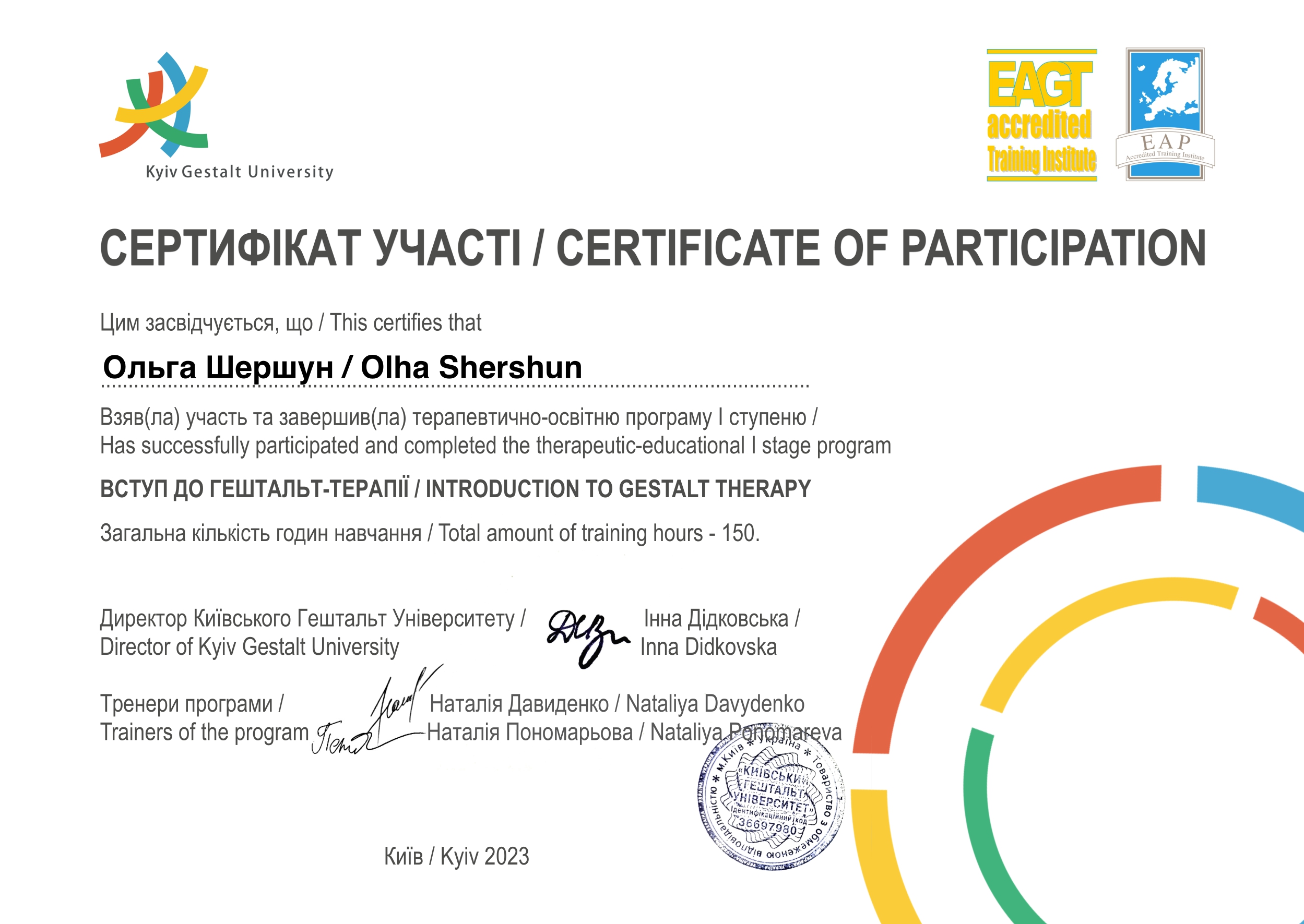 Привіт! Мене звати Ольга, я клінічний психолог і гештальт-терапевт у навчанні (2 рівень КГУ).