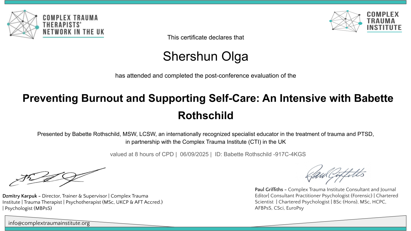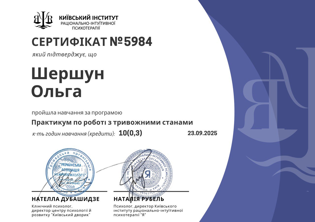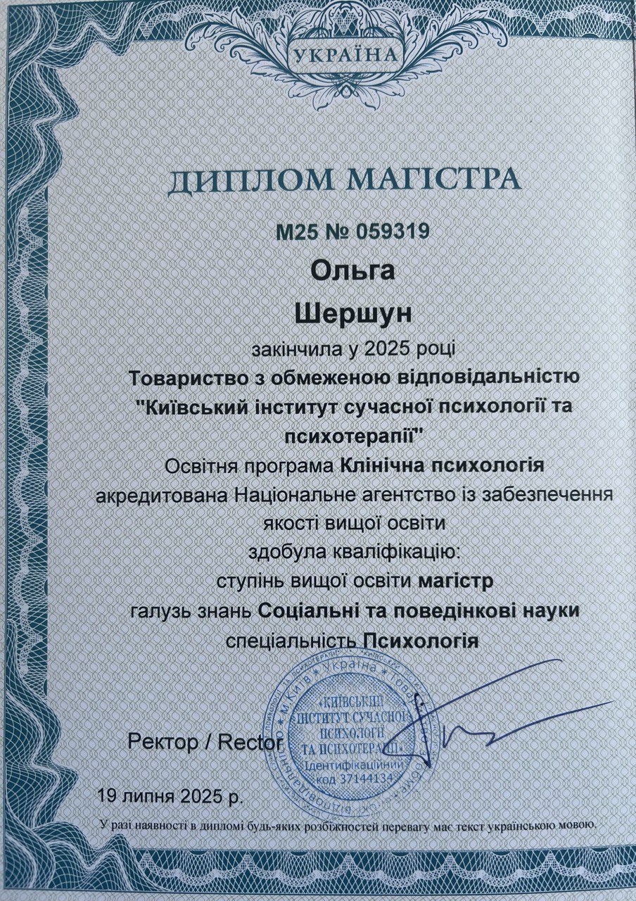 Під час навчання й практики я переконалася: криза може бути не лише випробуванням, а й точкою зростання. Я вірю, що щирий контакт та безпечний простір — перший крок до змін.