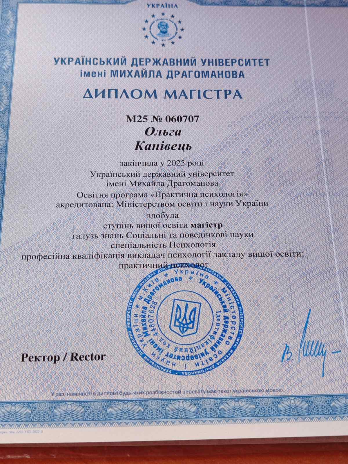 Я емпатійна, відповідальна та дисциплінована, уважна до деталей. Легко налагоджую контакт з людьми, зберігаю спокій у напружених ситуаціях. Дбаю про безпечне середовище для клієнта та повну конфеденційність розмов. Маю 30-річний досвід в педагогіці та психології.