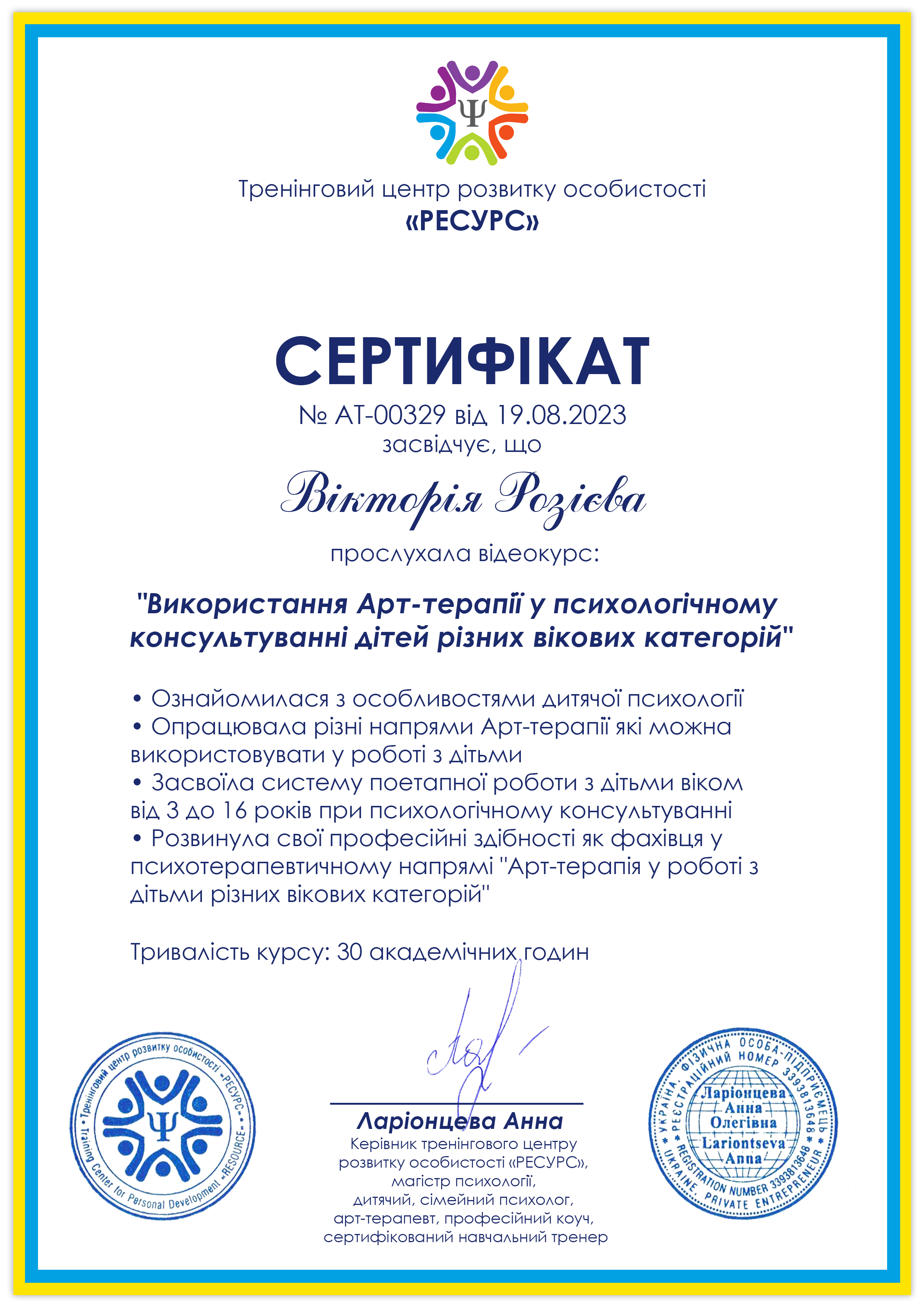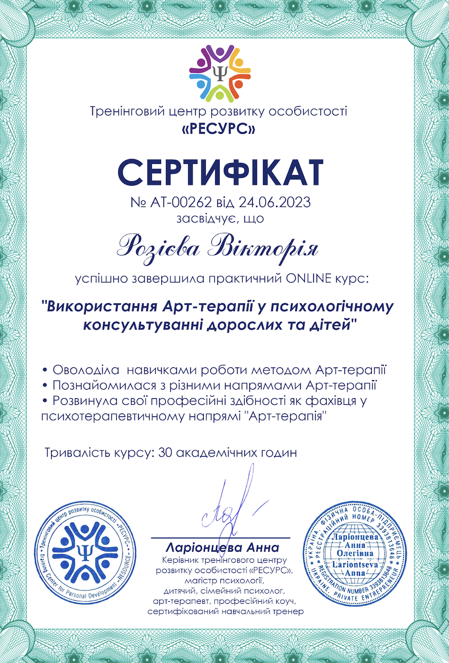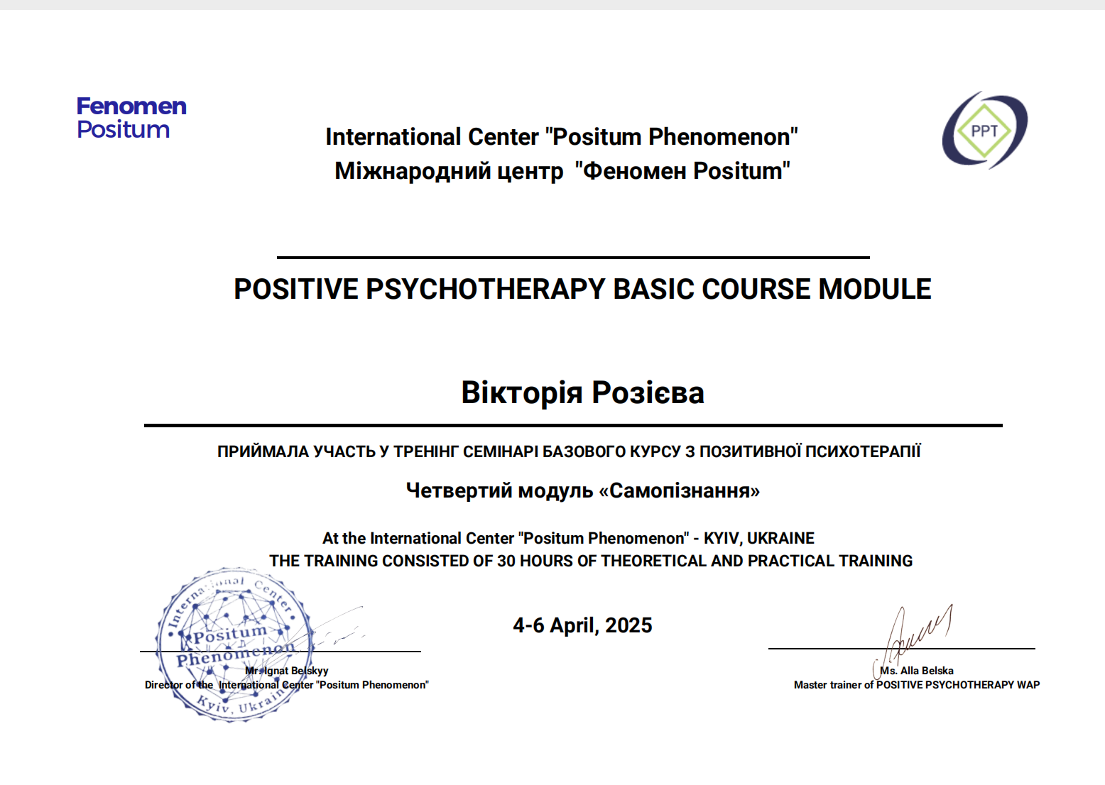 Мій підхід базується на методі позитивної психотерапії, яка допомагає знаходити ресурси навіть у складних обставинах. Я також застосовую арт-терапію та метафоричні карти для глибшого дослідження внутрішнього світу.