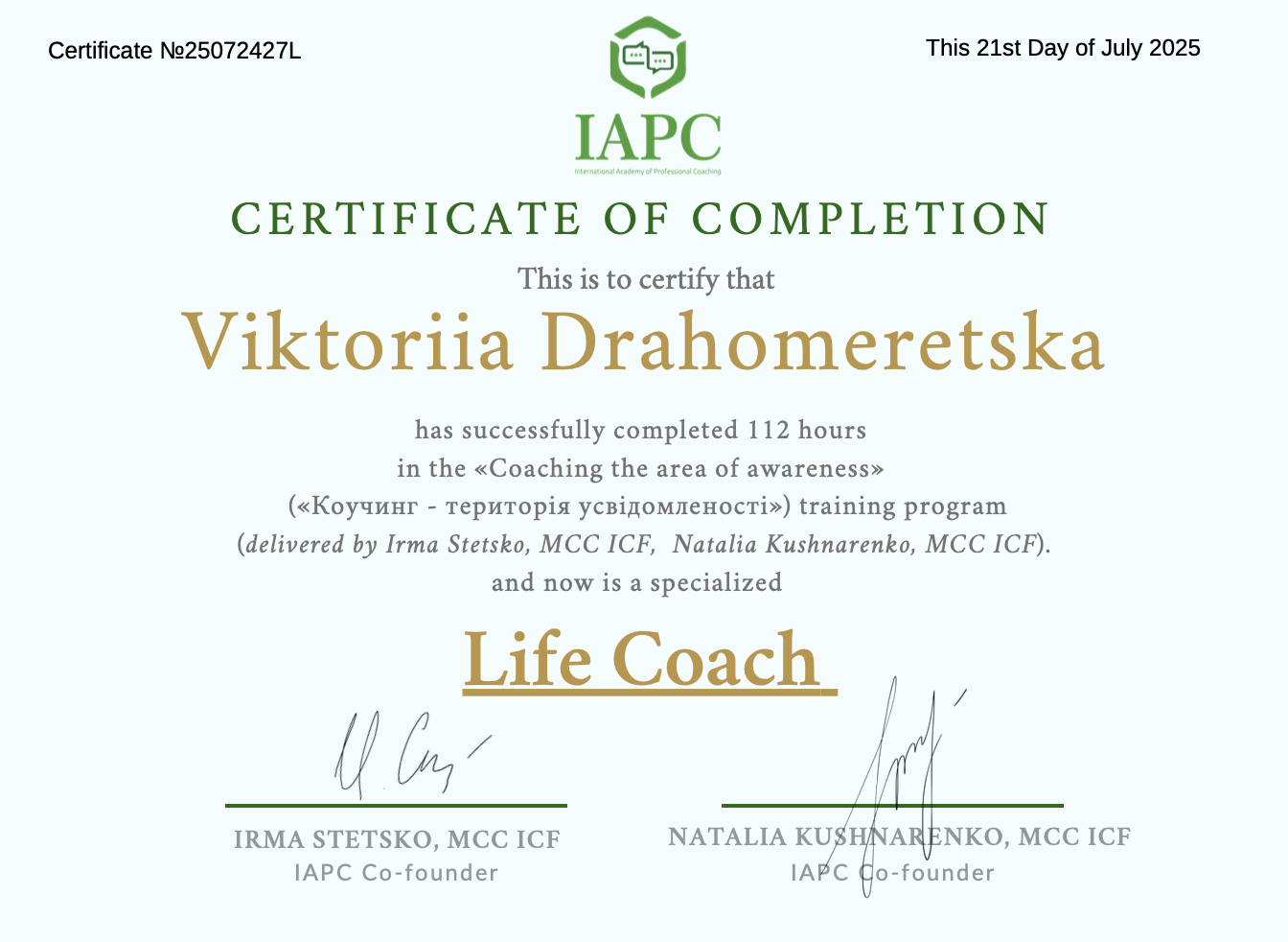 Мене звати Драгомерецька Вікторія Сергіївна — сертифікований коуч, груповий коуч, ігропрактик, викладач і фахівчиня з особистісного розвитку. Приватний підприємець, досвід керування дитячим центром розвитку, маю вищу педагогічну освіту та здобуваю освіту магістра психології.