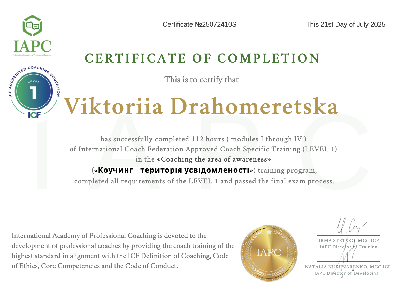 Працюю на перетині коучингута психології. Моє завдання — не «вчити тебе жити», а допомогти почути себе, усвідомити свої ресурси й перетворити хаос думок у чіткі дії.